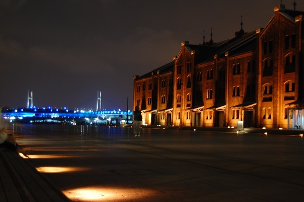 ライトアップされた赤レンガ倉庫。放送当初、ベイブリッジはまだ存在しない