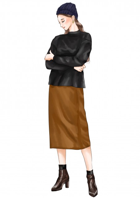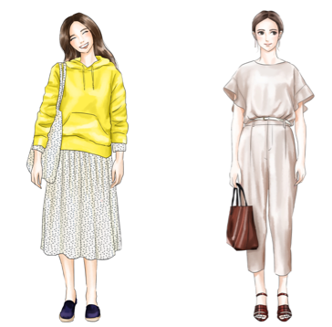 オーバーシルエットのトップスにタイトなボトムスあわせのスタイリング。スウェット等のカジュアルアイテムをタイトスカートやスキニーパンツであわせることで女性らしく着こなすのが今年のトレンドスタイル。