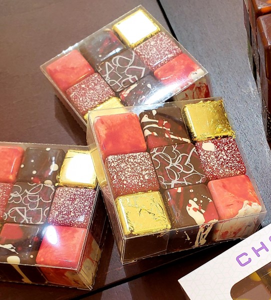 キューブ型の中にとろりと柔らかいフィリング入り。ライム&バジルのミルクガナッシュ、フランボワーズ&レモンのガナッシュとライチのジュレの2層、胡麻のプラリネと柑橘のジュレの2層、キャラメル&ミルクティーをデュルセイで仕上げたガナッシュなど全5種類の味が味わえます。