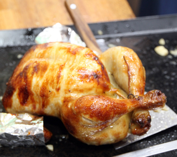 串に刺さった状態でロースターから運ばれてきたこんがり色のチキンは鉄板の上に寝かされ、ここでブエコさんとサチコさんの手により切り分けられます。ブエコさん曰く「お腹から開くのがブエノ流」とのことで、ハサミの入ったお腹から、ニンニクがワッと飛び出すさまはなかなかにイリュージョン。さながら“チキンマジック”といったところです。
