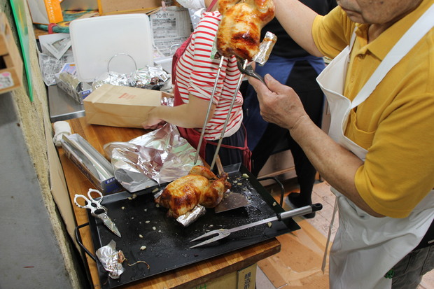 そうこうするうち、すでに稼働中のロースターから次々チキンが焼き上がってきます。ブエノチキンでは一羽丸ごとはもちろん、カットしての販売もあるため、そのさばく様子も見させてもらうことに。