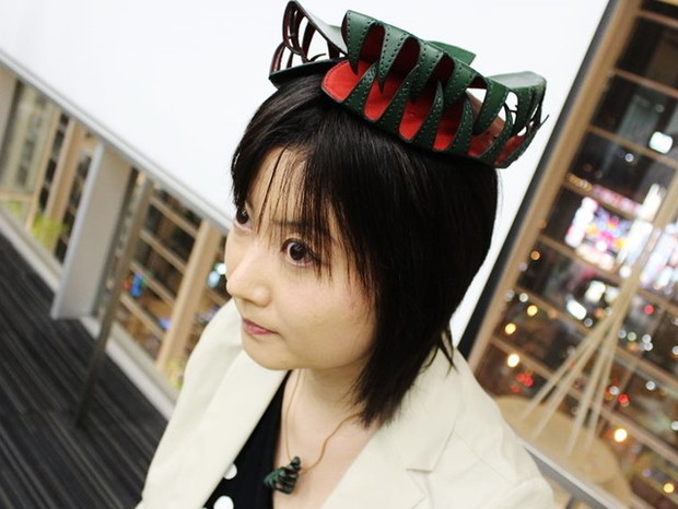 食虫植物を育て、食べ、愛でている木谷さん。ファッションにも取り入れている。ハエトリソウがモチーフの本革製帽子「ハエトリ帽」は、きちんと感覚毛もついている。職人さんによる手作りだそう。また、胸元には同じく革製のハエトリソウネックレスが。可愛い!