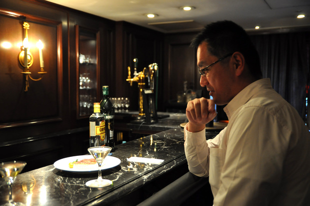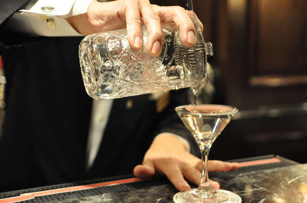 一見何の変哲もないように見えるが、グラスはドライ・マティーニが一番美しく見えるようにカットを入れたものを使い、オリーブの向きは赤い色が見えるほうが正面、刺しているカクテルピンの向きはお客様が右利きなら右、左利きなら左に置くと決められているそうだ。細部にまでこだわっているのだ。