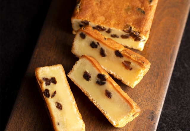 ミルキーなクリームチーズ&芳醇なカマンベールチーズをとろりと練りあげて、琥珀色の芸術品・オールドジャマイカラム香るジューシーラムレーズンをごろごろ散りばめ、じっくり窯焼きされたというチーズケーキで、クリーミーチーズとジューシーレーズンの劇的な出会いが楽しめる逸品とのこと。