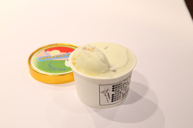 名古屋のメーカー、ぶらんぼんの味噌アイスクリーム。カクキュウ八丁味噌を味噌ベースのアイスにトッピング。少々香ばしくしょっぱい味は病みつきになります。