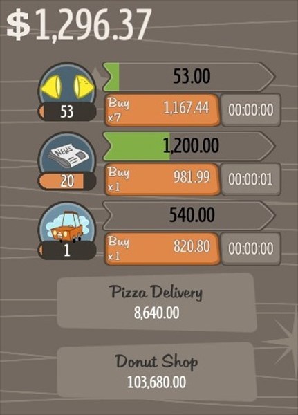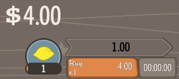 アイコンをクリックするとお金が手に入ります。得られる賃金は最初わずか1ドルですが、貯めたお金でレモネードを購入すると1クリックあたりの利益はどんどん増えていきます。