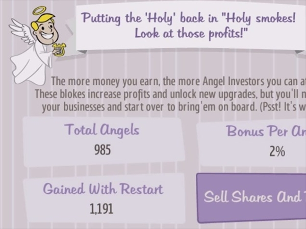お金を稼ぐと「エンジェル」というものが溜まっていくのですが、これは1つにつき2%利益を増やしてくれます。1000エンジェル貯まったら2000%。