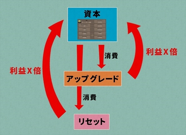 図にするとこのようになります。資本で稼いだお金をアップグレードとエンジェルに消費することで、利益率が倍々ゲームの倍々ゲームで膨れ上がるのです。