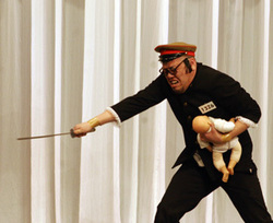 野性爆弾川島 頭の方で登場して、くーちゃんワールドで包んで見せたのが野性爆弾川島。どうです? 写真を見てもほとんど何をやっているかわからないでしょう。それ、正解です。絵描き歌をやったかと思えば、自作の音楽をBGMに赤ちゃんの人形を手に殺陣をりだして、最後はネタ時間3分をオーバーすると行われる、強制終了の「ドーン!」も組み込んで幕。※準決勝進出