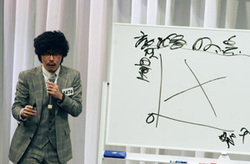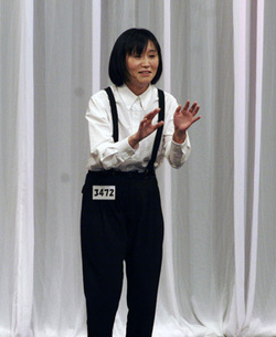 決勝進出経験がある大輪教授も、この日の登場だった。「座標の交点」をテーマに、人生をグラフにたとえるネタ。「OLがキャリアを重ね、対照的に結婚のチャンスが減っていったとき、交点で何が起きるか。室内犬を飼いはじめる!」感心とともに笑いを呼び起こす持ち味は健在だったものの…。※準決勝進出ならず