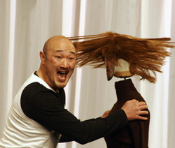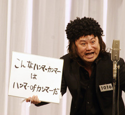 そして楽しい楽しいファンタジー部門(小道具付)、2連発。ということでまずは、くまだまさし。「今日はみなさん、気兼ねなく、見下せる人間がやって参りましたよ~」と、重量上げをしたり、イリュージョンを披露したり、ビックリ劇場まで展開してみせ「入場料は返しませんよ~!」。退路もなければ前途もない、孤高のショーを見せてくれたのだった。やや感動。