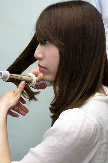 カットとブローも終わったところで、次はいよいよスタイリングに。すると、モテ髪をダイレクトに作る「平内巻(ひらうちまき)」を、なんとモデルさんが自分一人でできるようにレッスンしてくれるというのです!これは通常でも行っているそうで、「ヘアサロンに行った時だけバッチリ決まっているけど、あとは自分で全然スタイリングできずじまい」というあの悲しみを払拭してくれる、素晴らしいサービスです。ホント。