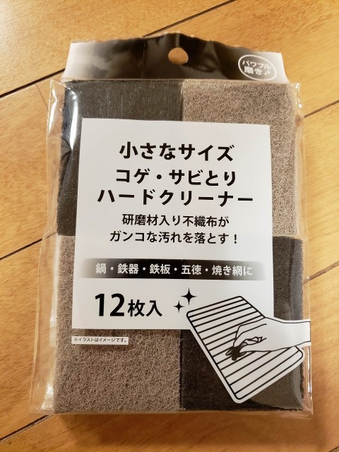 CaSy「これは、頑固な五徳や焼き網のコゲを素早く取ってくれるので、汚れに応じて使い分けることができます。小さくて薄いからこそ、コゲ・サビ部分にしっかり力が伝わって使いやすいです。たっぷり12枚入りなのも嬉しいですね」