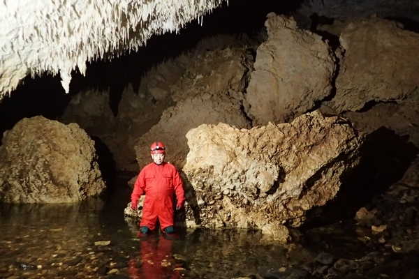 どうやらこの洞窟は「地底の川の上流」に当たるところらしく、途中には巨大な岩がゴロゴロしています。恐らくは天井から落下してきたものだそうで。恐ろしい。