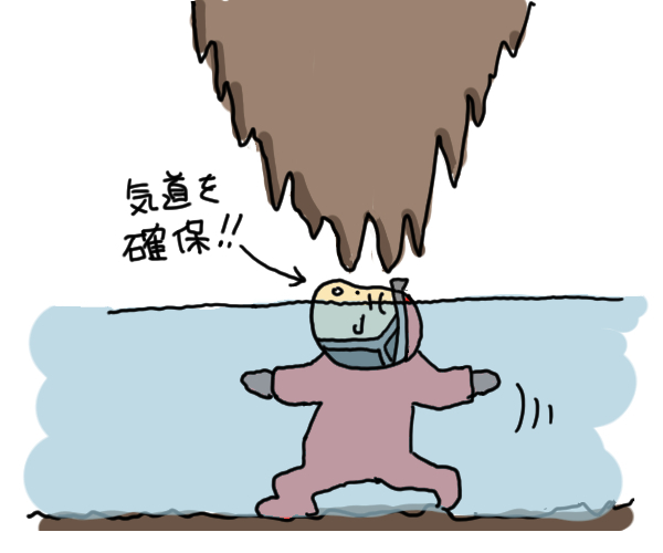 図にするとこんな感じ。顔を上に向け、鼻で気道を確保。この状態で、前にゆっくりと進んでいくわけです。天井と水面との隙間は数センチ。本当にギリギリを通過していく感じです。