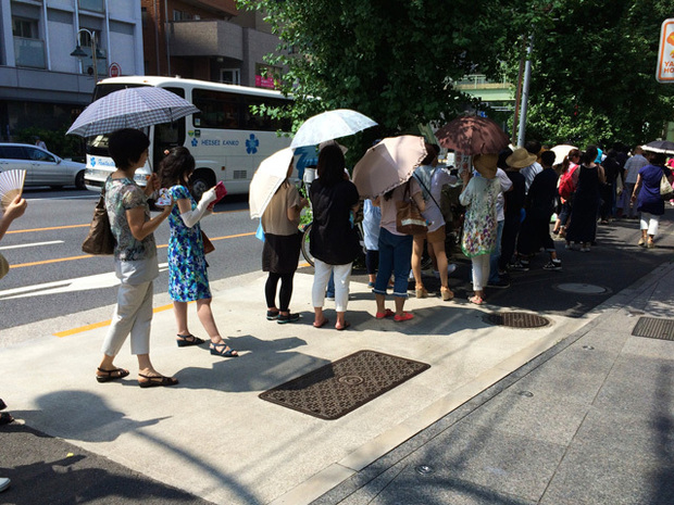 ちもとの名物といえば「八雲餅」と、「かき氷」と、この「行列」。近隣や通行の方々の邪魔にならない気配りを。《ちもと》