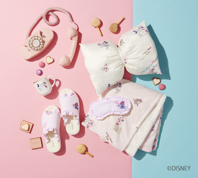 (第1弾発売商品)ヘアバンド 1,400円、パジャマトップス 4,000円、パジャマロングパンツ 4,000円、ミッキー巾着S 1,000円、ミニー巾着M 1,800円