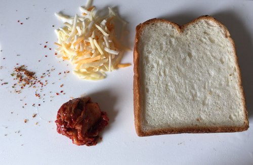 パンにチーズを敷き詰めた上から、キムチを乗せる。キムチの量はお好みでOK。