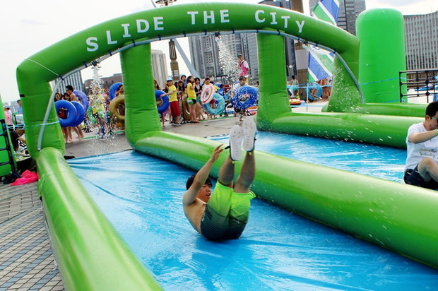 基本的には浮き輪で滑るのだが、中には自分の身体ひとつでかなりアクロバティックな滑り方をする人も!