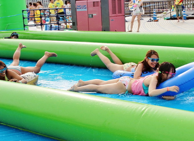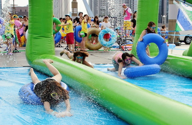 ウォータースライダーと言えばすべり台のような傾斜がついているものが一般的だが、ここは元々道路なのでほぼ傾斜はない。