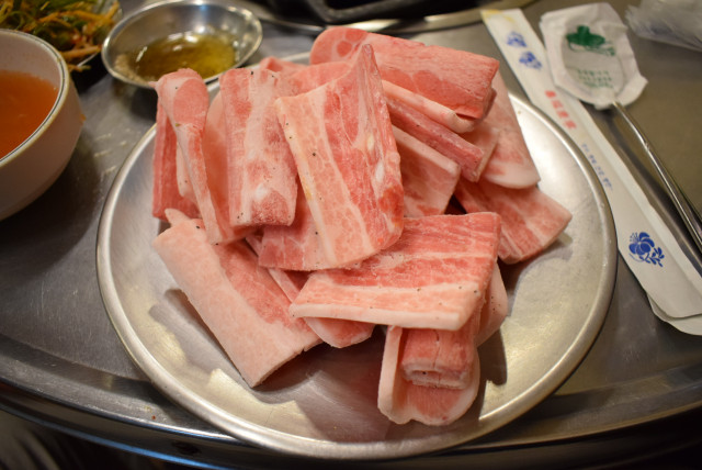 この店はそんな昔のスタイルにこだわって、170グラム12000ウォンという手ごろな値段でサムギョプサルが食べられる店だ。薄切りの豚バラ肉はお腹をふくらませるというより、お酒を美味しく飲むためのつまみと言うほうがぴったりくる。