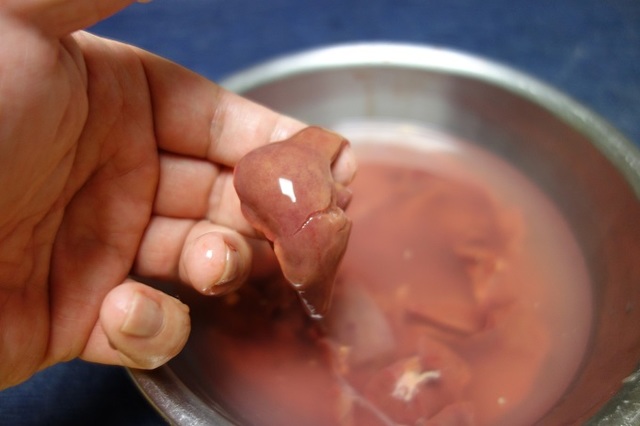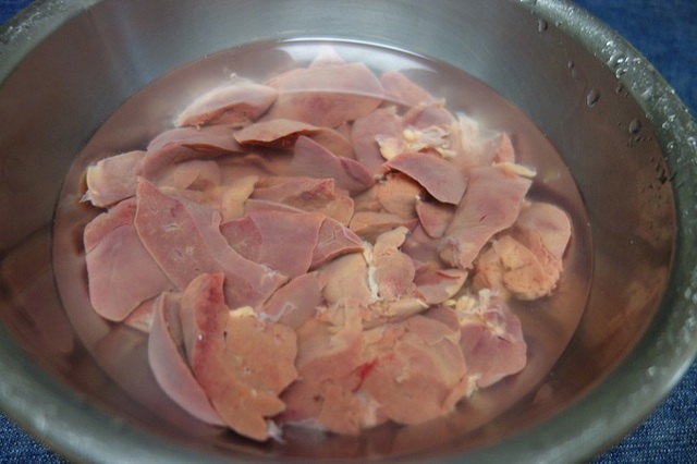 4・次に、3ミリ程度の厚さにカットしたレバーをよく水洗いします。