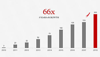 スマートフォン出荷台数は10年の300万台から18年には2億台に伸び、約66倍になった。かつてはスマートフォン世界市場のランキングにおいて「その他」だったところから、現在はトップ3スマートフォンにランクされている。18年第2四半期と第3四半期には、世界第2位のスマートフォンメーカーとなり、IDCの「global smartphone market share, 3rd quarter of 2018」によると世界シェアは14.6%だった。