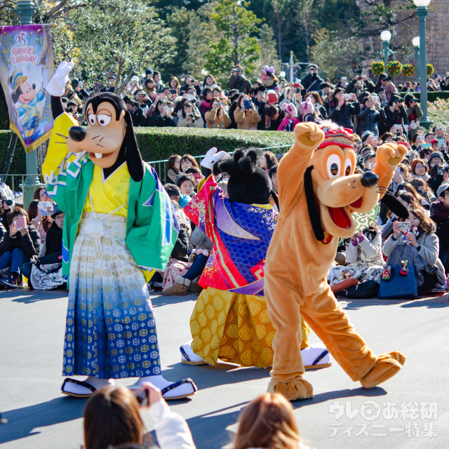 「ニューイヤーズ・グリーティング」では、笛や太鼓などお正月らしい音楽が流れると、着物姿のディズニーの仲間たちが賑やかに新年をお祝いします。