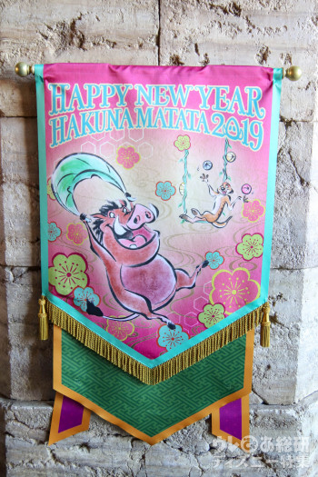 バナーには、着物を着たミッキーマウスやドナルドダック、『ライオン・キング』のキャラクターたちがデザインされいます。