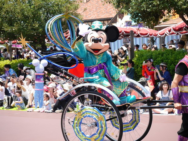 パレードルートで1日2回開催されるこちらのパレードは彦星に扮したミッキーと、織姫の姿の姿をしたミニーがそれぞれ人力車に乗って、七夕でおなじみの「たなばたさま」の音楽にのって登場します。通常の季節のパレード等に比較すると、短めのショートパレードとなっています。