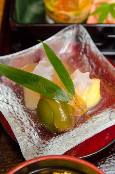 冬瓜の甲州煮とアセロラゼリー、星形ナタデココと青梅蜜煮添え