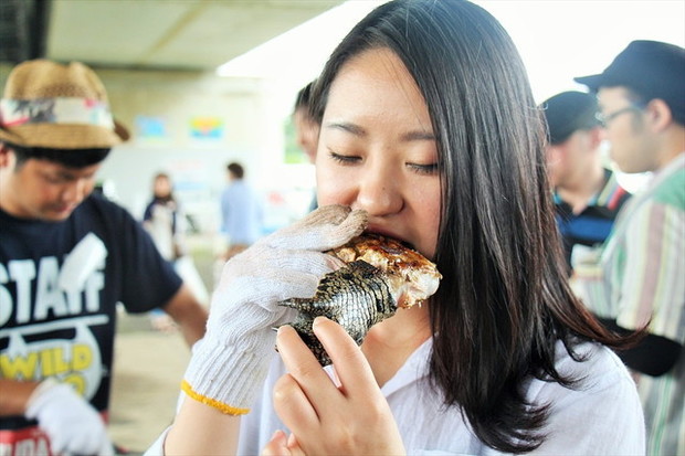 参加者に、どの肉を食べたいかと聞いて回った際、一番に名前が上がった動物、「ワニ」です。皮を完全に剥いでしまうと鶏肉と間違えそうな質感。今回は肉以外にも、舌と足もバーベキューします。あの獰猛な姿と見た目によらず、味はとても淡泊。脂肪分もそれほど感じなかったので、ワニと言われないと分からないくらいです。