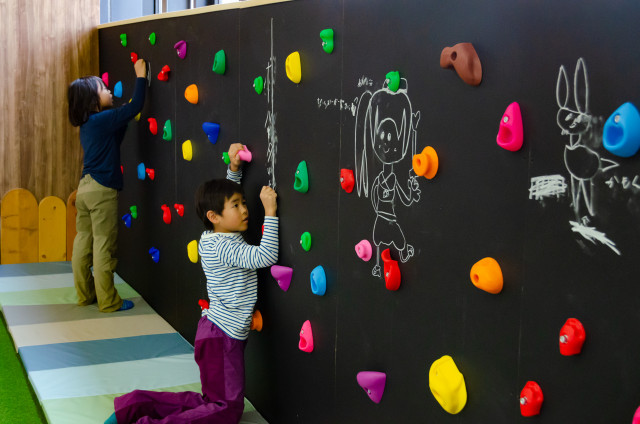 専用ルーム内には、さまざまな遊具や仕掛けがあり、スノーボードブーツを履いたまま遊ぶことで、慣れないブーツでバランス感覚を掴んだり、準備運動にもなり、一石二鳥。