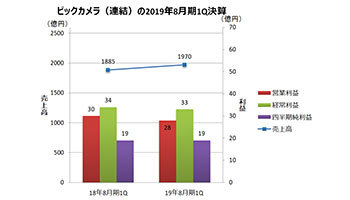 ビックカメラは1月10日、2019年8月期第1四半期(9~11月)の連結決算を発表した。売上高が1970億円(前年同期比4.5%増)、営業利益が28億円(5.1%減)、経常利益が33億円(2.6%減)、親会社株主に帰属する四半期純利益が19億円(2.4%減)の増収減益となった。