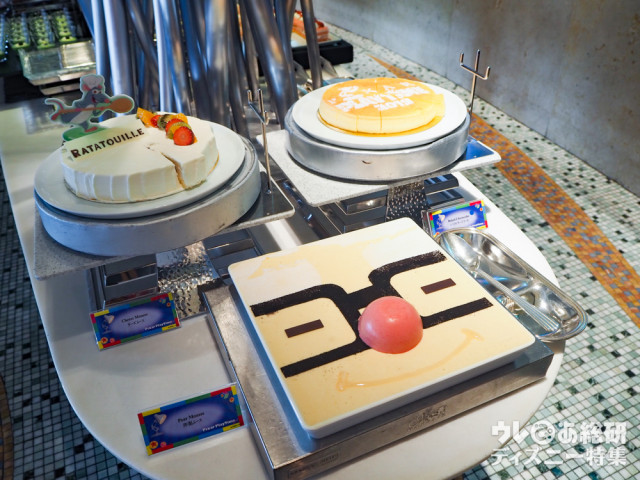 ブッフェ台で最初に目を引くのは、カールじいさんの顔が描かれたケーキと、レミーが乗ったケーキ、そしてピクサー・プレイタイムのロゴが描かれたケーキ。