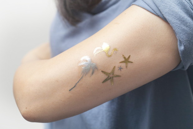 山奥のフェス会場は、どちらかというとワイルドな環境になりがち。風雨に晒されれば、ドロドロになることも。それはそれでいい思い出になるものですが、こんな感じでフラミンゴや貝殻のタトゥーを貼れば、気分はもうビーチリゾート!