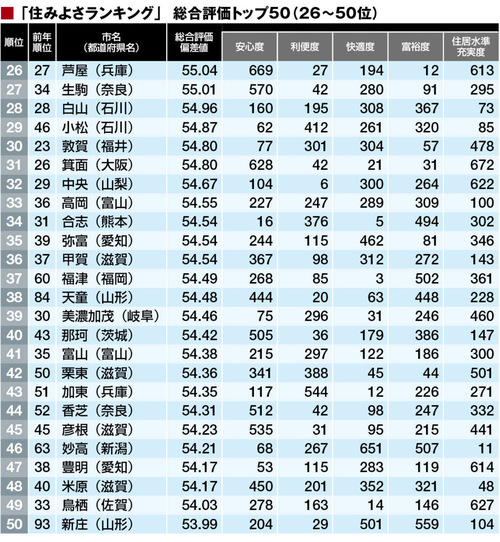 ※このランキングは、2015年6月22日現在の791都市(全国790市と東京区部全体)を対象とし、公的統計をもとに、それぞれの市が持つ“都市力”を、「安心度」、「利便度」、「快適度」、「富裕度」、「住居水準充実度」の5つの観点に分類し、採用15指標について、それぞれ平均値を50とする偏差値を算出、その単純平均を総合評価としてランキングしたもの。(東洋経済発表「住みよさランキング2015」トップ50)