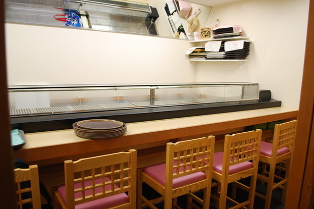 調理実習室には、寿司カウンターがあり、寿司職人養成学校の生徒さんたちが本番さながらの実習をします。学校では食品学、栄養学の他に色彩や英会話なども学ぶことができます。最短だと1ヵ月でプロの域まで到達できるそうなのですが・・・。ちょっと趣味で習う感覚では入れない感じ(汗)