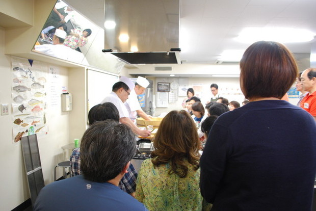 お教室が始まると、現役の寿司職人さんの周りに集まり、楽しいトークから始まります。そして、まず始めに「すし飯作り」を見学・・・の、予定でしたが、この日はちょっとしたアクシデントがあり、すし飯は中止に。その代わり、特別に職人さんが作る寿司屋の「厚焼き玉子」の作り方を公開。これも滅多に見られない仕込みなので、みんな興味津々。