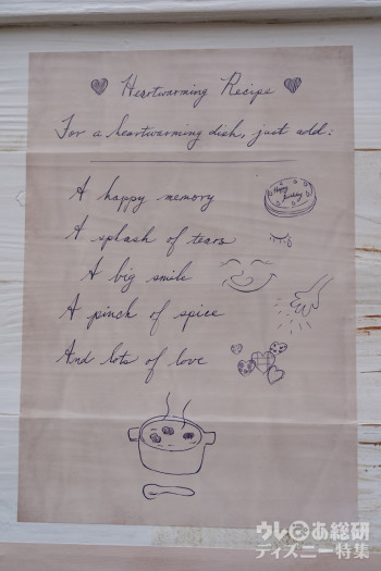『心あたたまる料理には、次のものをちょっと加えるだけ:幸せな思い出、1粒の涙、満面の笑み、ひとつまみのスパイス、そして、たくさんの愛』