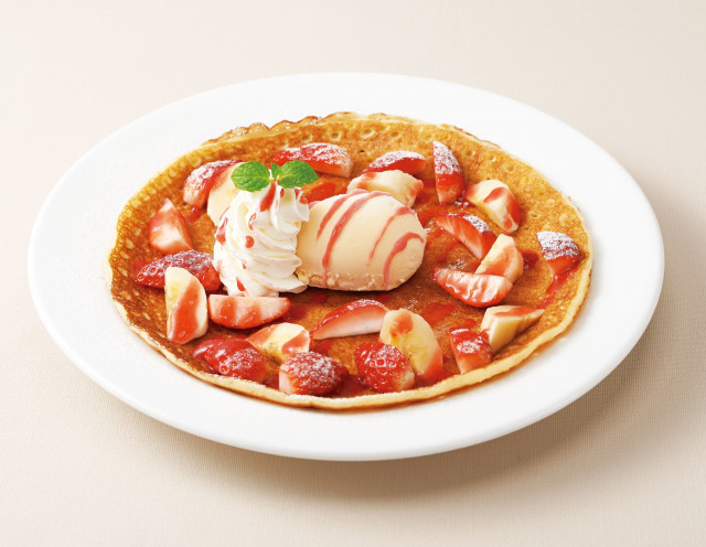 店舗で1枚1枚丁寧に焼き上げたバターが香るガレットに、苺、バナナ、アイス、ホイップクリームをトッピング。苺ソース×バニラアイスまたは、チョコソース×チョコアイス、好きな味わいで旬の苺が楽しめます。