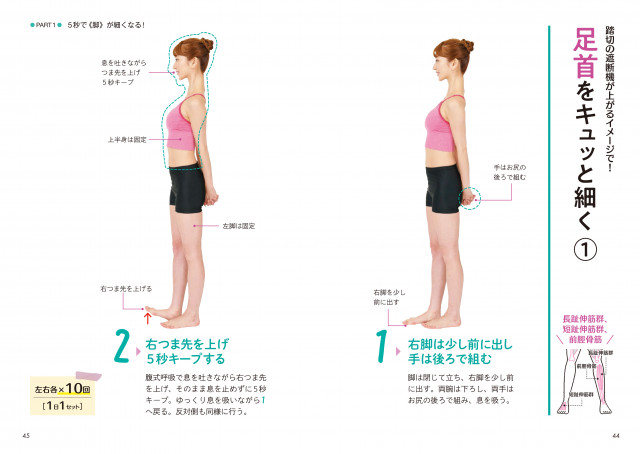 脚は閉じて立ちます。両手をお尻の後ろで組んだら、息を吸います。 - 腹式呼吸で息を吐きながら、右足のつま先を上げ、息を止めずにそのまま5秒キープします。ゆっくり息を吸いながら、1の体勢に戻ります。