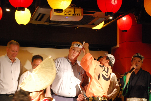 今回はNY出身のスミさんが選ばれ、コミカルな動きで踊りまくり、拍手喝采を浴びていました。手ぬぐいを頭に巻いてもらい、最後に仲間で記念撮影。他のお客さんたちも連の人たちと写真を撮ります。