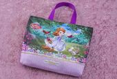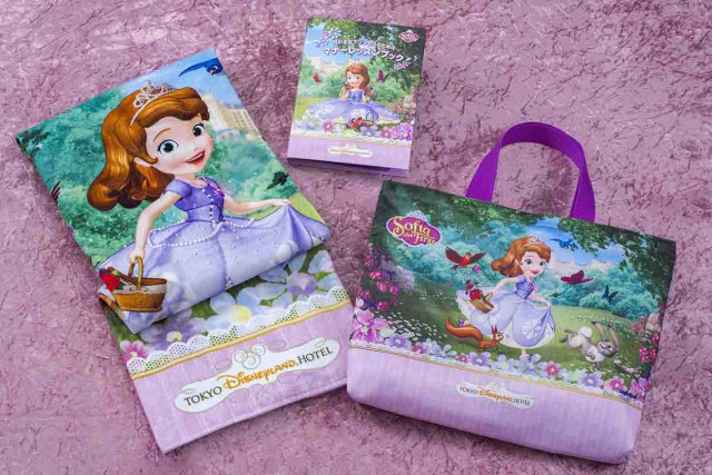 森でお花摘みを楽しむソフィアたちをデザインした「レッスンバッグ」と「タオルケット」、物語に出てくるソフィアのプリンセステストをイメージ した「ちいさなプリンセスのためのマナーレッスンブック」も提供されます。