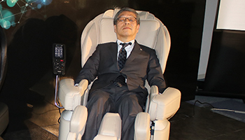 「サイバーリラックス マッサージチェア AS-2000」の使い心地を試すフジ医療器の大槻利幸社長