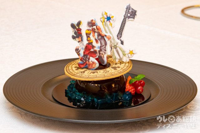 チョコレートムースの上には、砂糖菓子でできたソラたちやキーブレードと、ミッキーやハートレスのシンボルがデザインされた焼き菓子が添えられています。