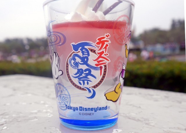 スーベニアカップは夏らしいクリアなプラスティック製のカップで、ランチケース同様にミッキーとドナルドの雄姿がデザインされています。