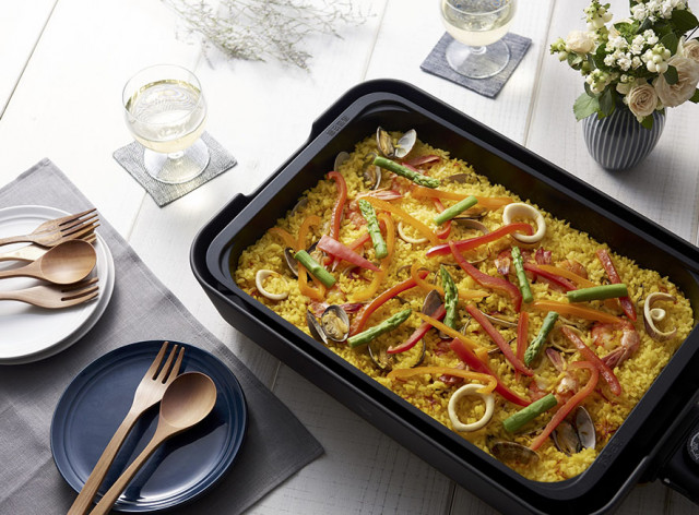 深さ4cmの「深型プレート」で、スープや具材がこぼれにくく、焼く、煮るがこれ1台で! 20メニューを掲載したレシピブックも付属しています。