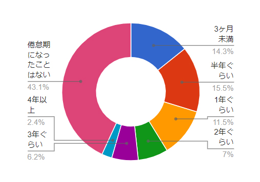 なんと4割以上が倦怠期・未経験の方。同じく4割以上が数ヶ月〜1年程度で、倦怠期になったことがあると実感していました。倦怠期は意外と早くやってくる?