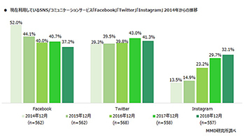 「Facebook」「Twitter」「Instagram」の利用について聞いたところ、「現在利用している」という回答は、Facebookが37.2%、Twitterが41.3%、Instagramが32.1%になったとのこと。調査開始時の14年にFacebookの利用は52.0%だったため、4年で14.8ポイント下がったという。一方、Instagramの利用は14年に13.5%だったため、上がったことになる。なお、Instagramは17年12月と比較すると2.4ポイント増えていることも分かったとのことだ。
